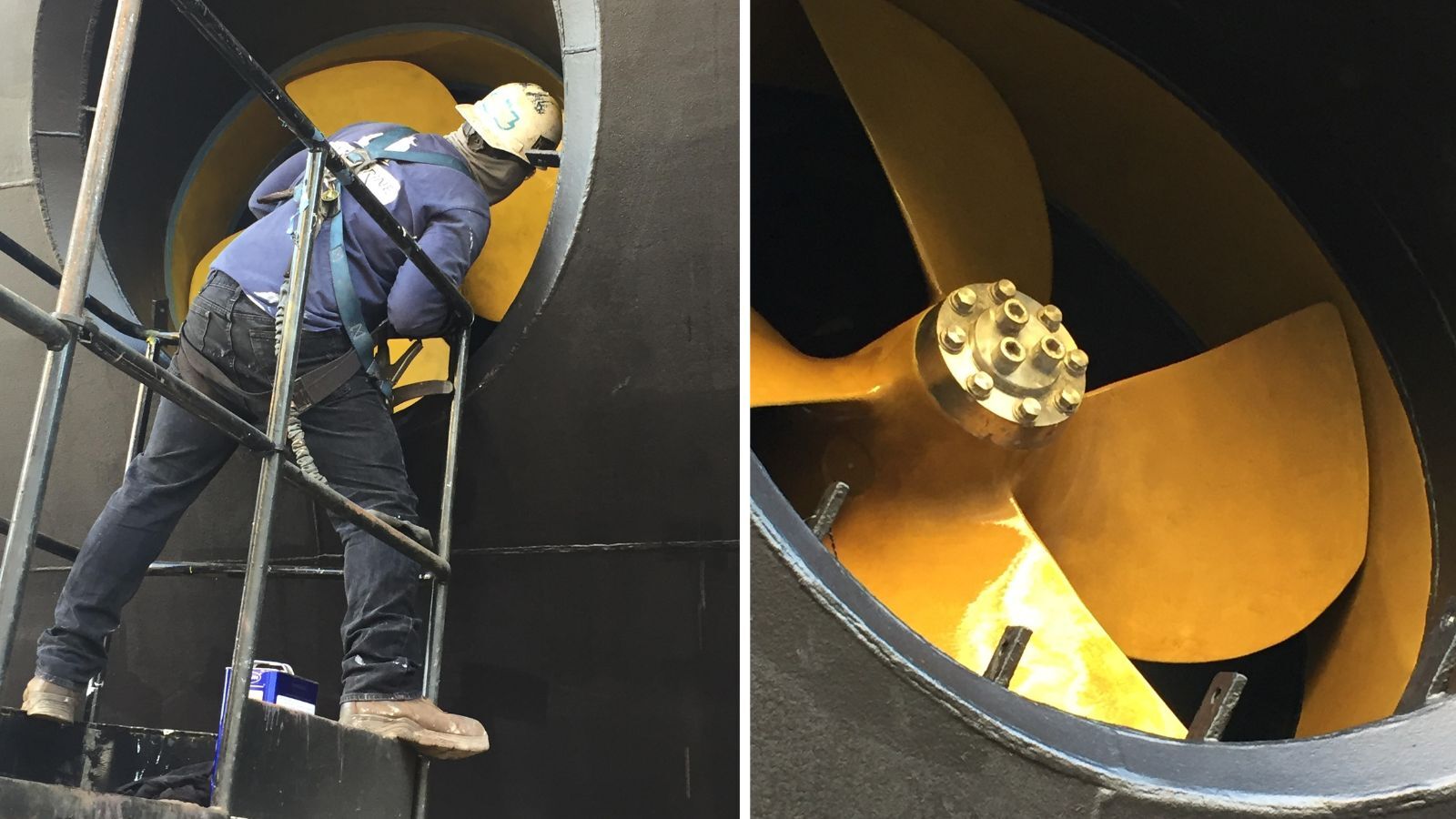 Our resident Propspeed guru Mark Billingsley was asked to oversee the application and specify the quantity of product needed. It took five applicators 8.5 hours to coat the mains (two five-bladed propellers, each six feet in diameter), two shafts (each seven inches in diameter and 14 feet long), a thruster (four-bladed and five feet in diameter) and the thruster tunnel wearing ring (18 inches wide and 15.7 feet long).
