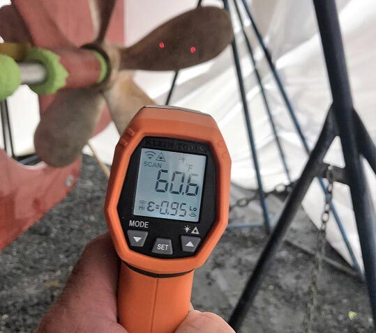 If you’re in an unheated building, you can use oil heaters or torpedo heaters to heat the running gear and surrounding area the night before the application. Just be sure not to heat any of Propspeed’s components. Propspeed performs best between 50 and 90 degrees. Most yards have it either in the stock room or another controlled environment, away from freezing temperatures or excessive heat.